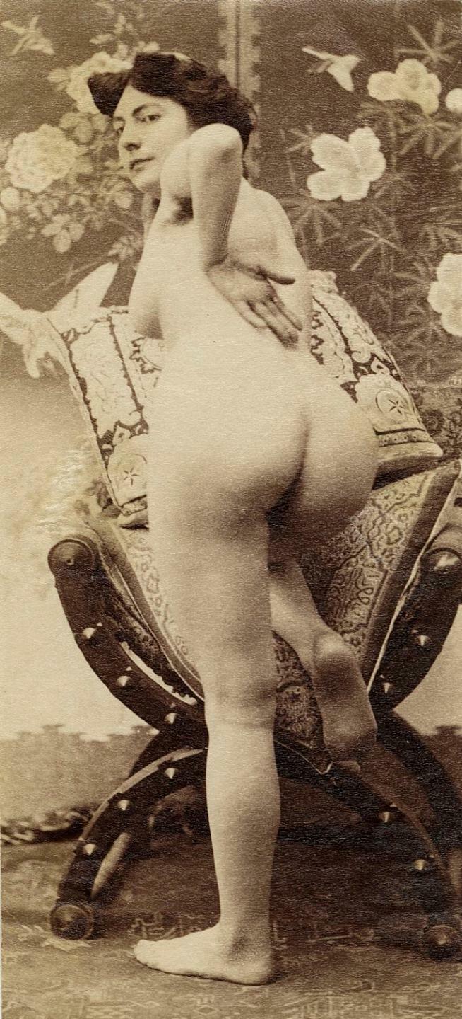 Femme nue de dos, le genou droit posé sur un fauteuil curule. Elle replie son bras gauche vers l'arrière et pose la main sur sa taille. Elle tourne la tête vers le photographe.