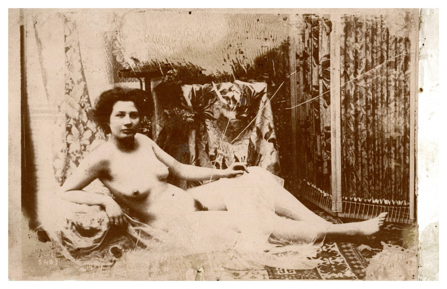 Si la mention du carton ne laisse pas de doute sur la diffusion en Perse de cette photographie, en faire un exemple de production de la période Qadjar tardive relève de la méprise : on peut encore clairement lire le monogramme JMC et le numéro 5403 sur cette épreuve. De même, la qualification du modèle en prostituée est gratuite.