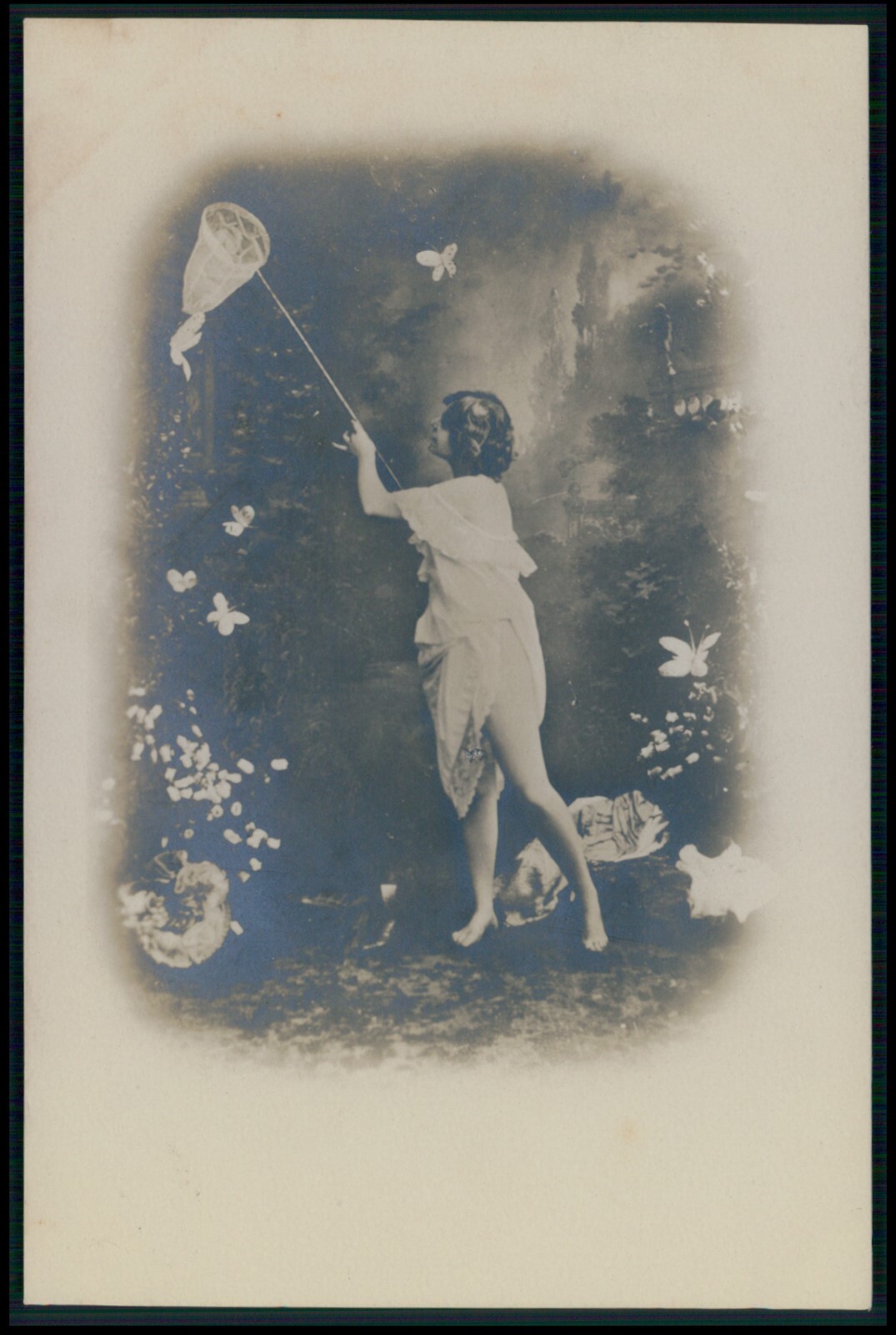 Femme à demi-dévêtue debout de profil dans un décor de jardin. Elle tient dans les mains un filet à papillon et cherche à attraper les papillons (factices) qui décorent la scène.