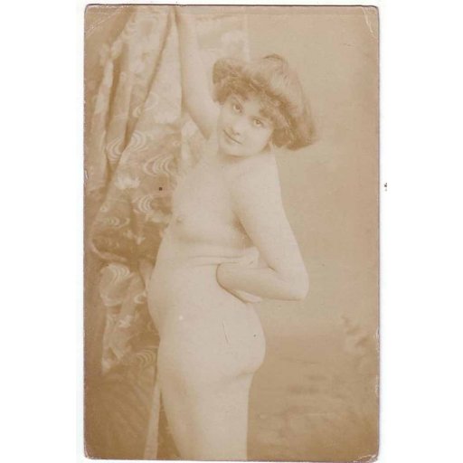Femme nue debout de profil en plan italien. Elle tourne la tête vers l'objectif tout en portant la main droite au sommet du support d'une draperie et la main gauche retournée contre la hanche.