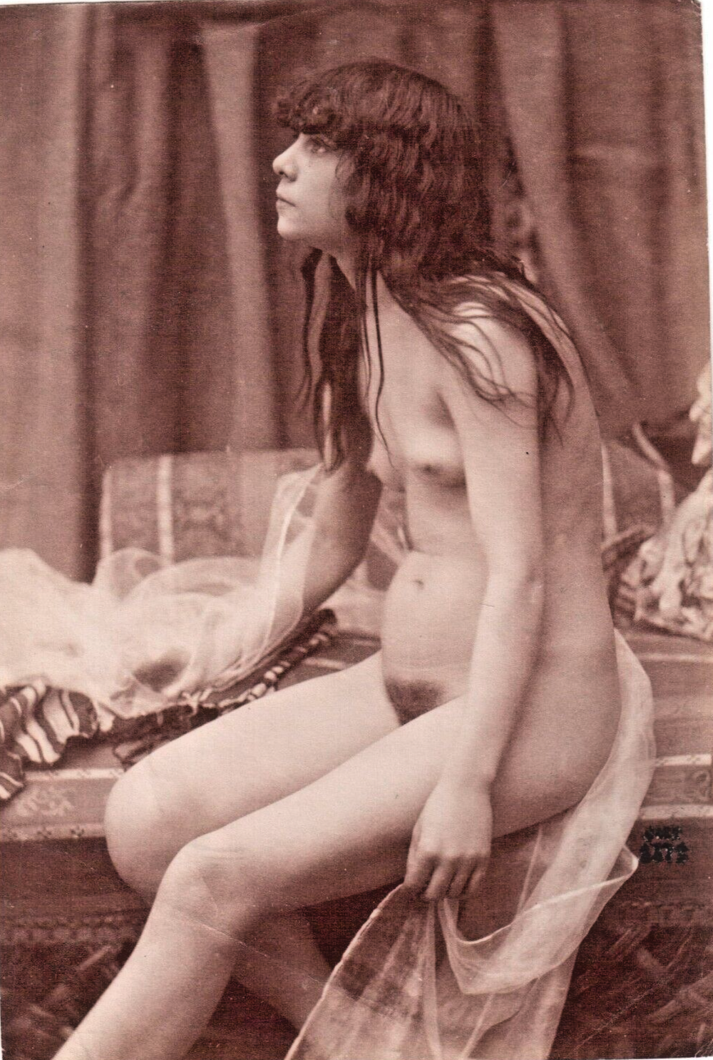 Jeune femme nue assise de profil sur le bord d'une méridienne. Elle tient entre ses mains un voile transparent et regarde devant elle d'un air concentré.