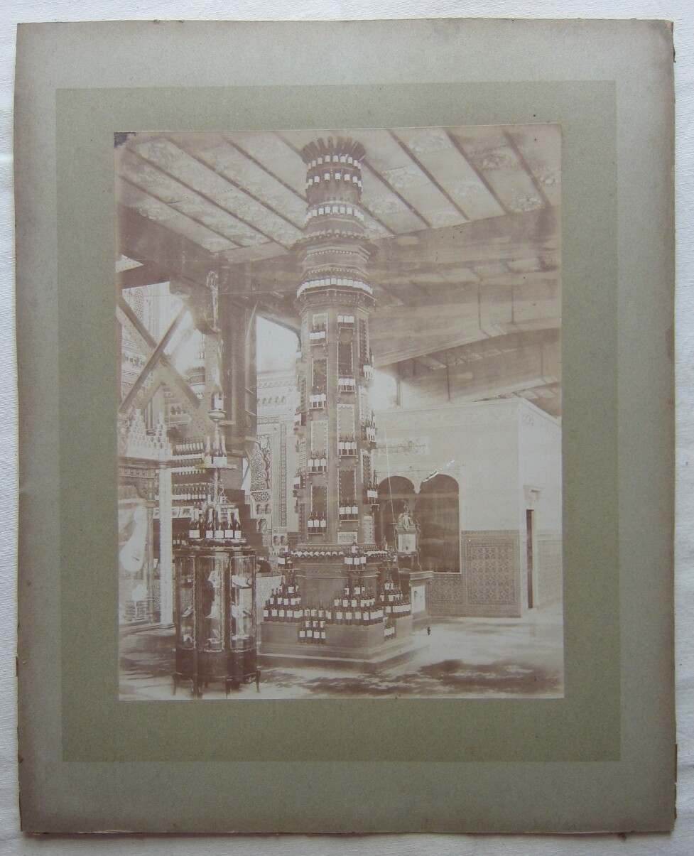 Grande photographie albuminée signée par le photographe espagnol établi à Paris Josep Maria Canellas (1856-1902), montée sur carton, beau plan sur un stand de bouteilles de vins ; on voit quelques inscriptions en espagnol, et notamment Abarzuza y C°, Cadiz ; peut-être pris lors d'une foire commerciale ou stand de vins espagnols lors d'une exposition ; possible exposition de Paris 1900.