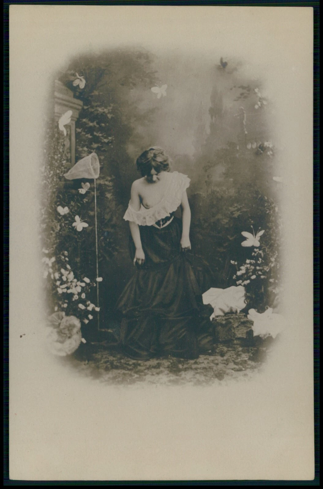 Femme à demi-dévêtue debout dans un décor de jardin. Son chapeau, sa veste et son corsage sont étalés sur le sol. Un filet à papillon est posé contre un pilastre sur la gauche. Des papillons (factices) décorent la scène.