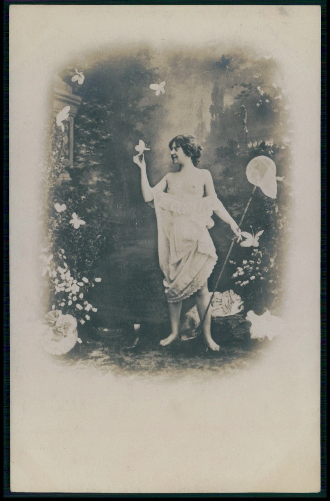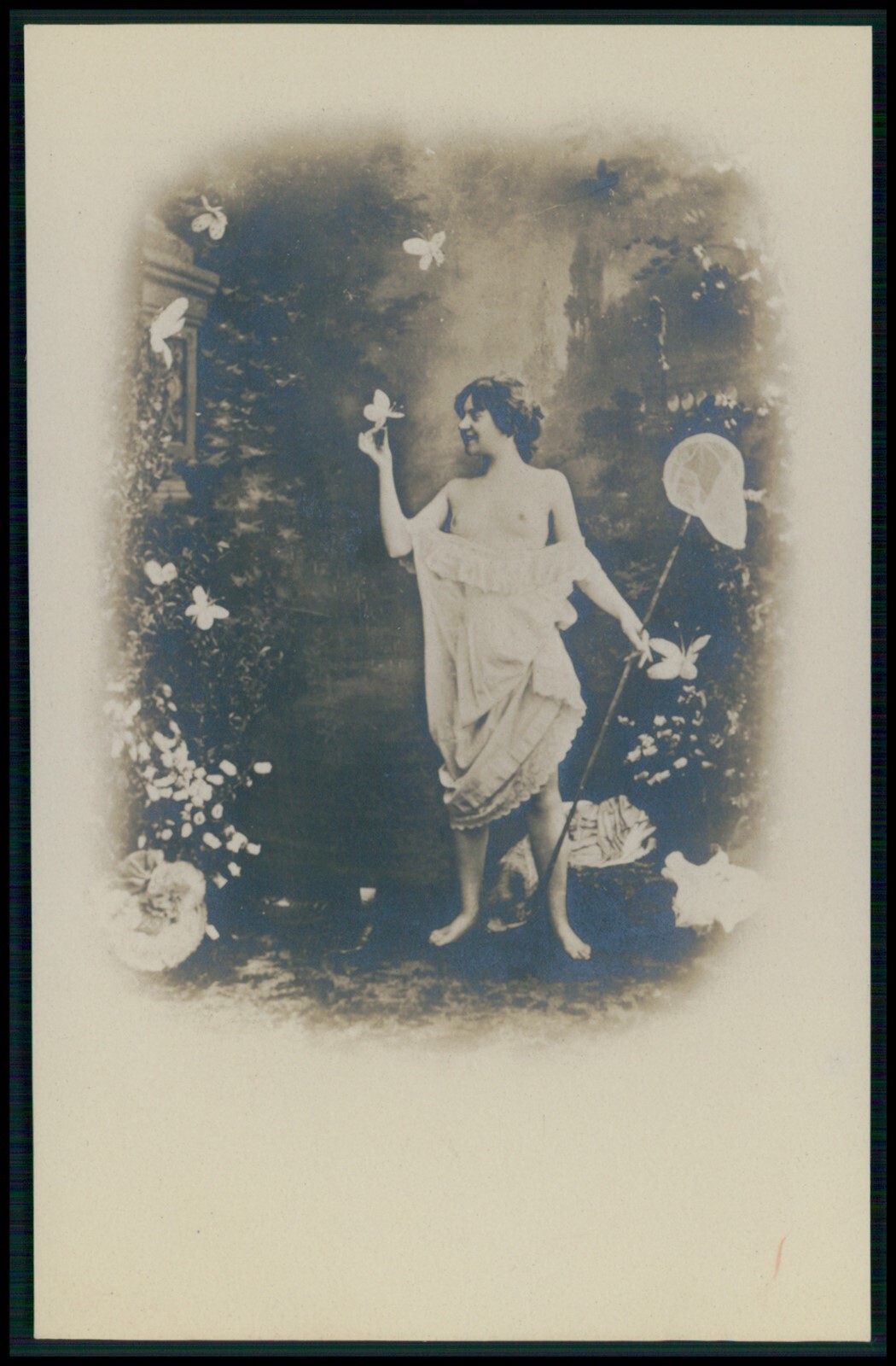 Femme largement dévêtue debout dans un décor de jardin. Elle tient dans une main un filet à papillon et dans l'autre un papillon (factice) qu'elle vient manifestement d'attraper.