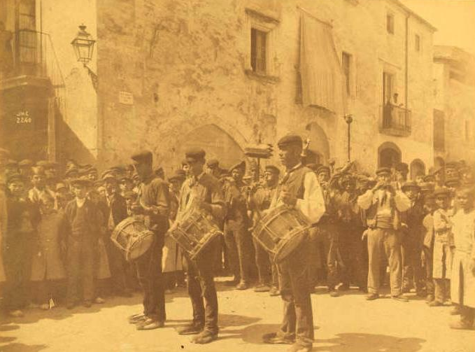 Musiciens (tambours, grallas) accompagnant les membres d'une « colla castellera » (groupe de personnes élaborant entre eux des tours humaines, ou « castell ») au cours d'un défilé à l'occasion de la fête patronale de Vilafranca.