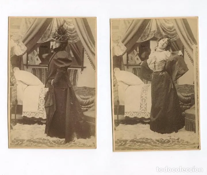 Femme en tenue de ville (veste, chapeau, parapluie) posant dans un décor de chambre à coucher.