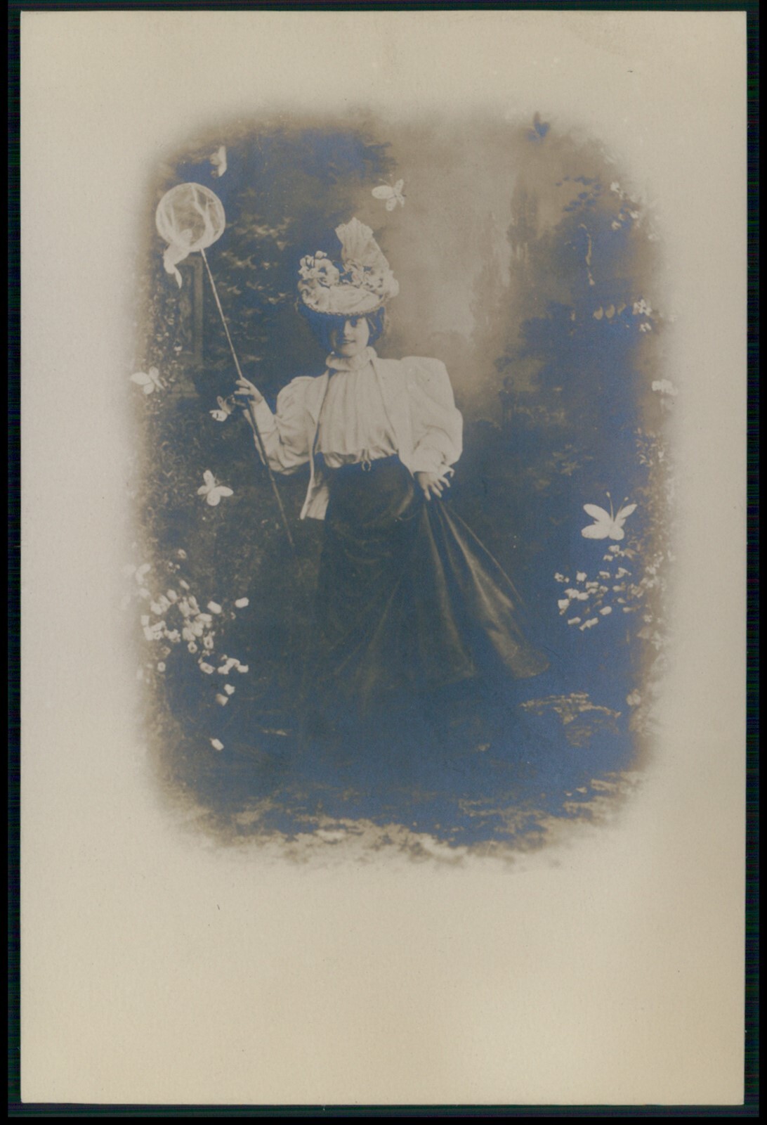 Femme debout dans un décor de jardin tenant à la main un filet à papillon. Elle est entourée de papillons (factices).